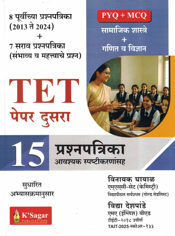 या परीक्षेचा अभ्यास करताना, आपल्या अभ्यासाला योग्य दिशा मिळावी आणि सोबत महत्त्वाच्या प्रश्नांची तयारीही व्हावी, या उद्देशाने २०१३ ते २०२४ च्या आठ पूर्वीच्या प्रश्नपत्रिका आणि सात सराव प्रश्नपत्रिकांचा समावेश असलेला विनायक घायाळ व विद्या देशपांडे लिखित ‘TET पेपर दुसरा १५ प्रश्नपत्रिका’ या पुस्तकाची सहावी आवृत्ती आपल्या हाती सोपवित आहे. या पुस्तकातील विज्ञान व गणित या भागांचे लेखन विनायक घायाळ यांनी तर उर्वरित भागांचे लेखन विद्या देशपांडे यांनी केले आहे.
